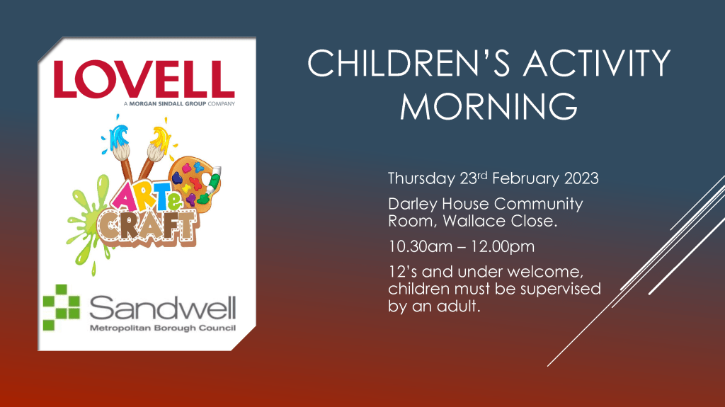 Calling all children aged 12 and under*. We’re running a half-term ‘Arts and Crafts’ morning on Thursday 23rd February at the Darley House Community Room in Wallace Close 10:30am to 12pm.